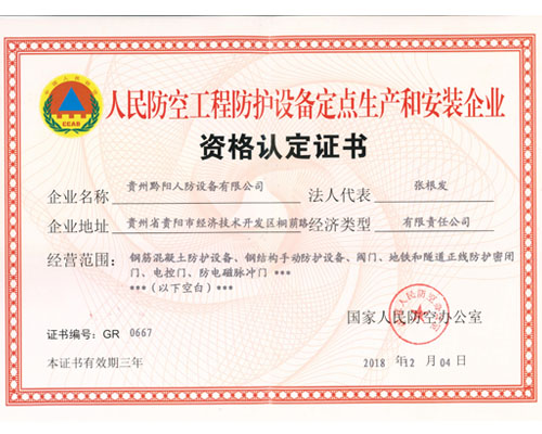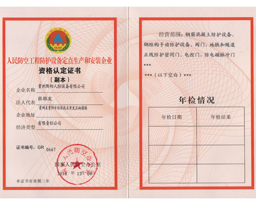 貴州黔陽人防設備有限公司具有獨立法人資格企業,公司成立于2005年,注冊資金2008萬元,經營范圍為鋼筋混凝土防護設備、鋼結構手動防護設備、閥門及地鐵和隧道正線防護密閉門。公司擁有一支長期從事國防軍工工作,技術、管理水平高的人防工程生產制作及施工安裝專業隊伍和一批高、中級工程專業技術人員。本公司占地面積13800多平方米,具有各種專業機械加工設備、先進的質量檢測儀器設備,大型的專用工作平臺、震動平臺及其他專業平臺,年生產能力10000樘以上。多年來,凡由我公司承接的工程項目,在施工制作、安裝方面,一直受到各級人民防空辦公室及開發商的好評。被貴陽市國防動員委員會評為“貴陽市人民防空先進單位” ;被國家貴陽經濟技術開發區評為“目標管理先進企業”,并且是ISO 900......